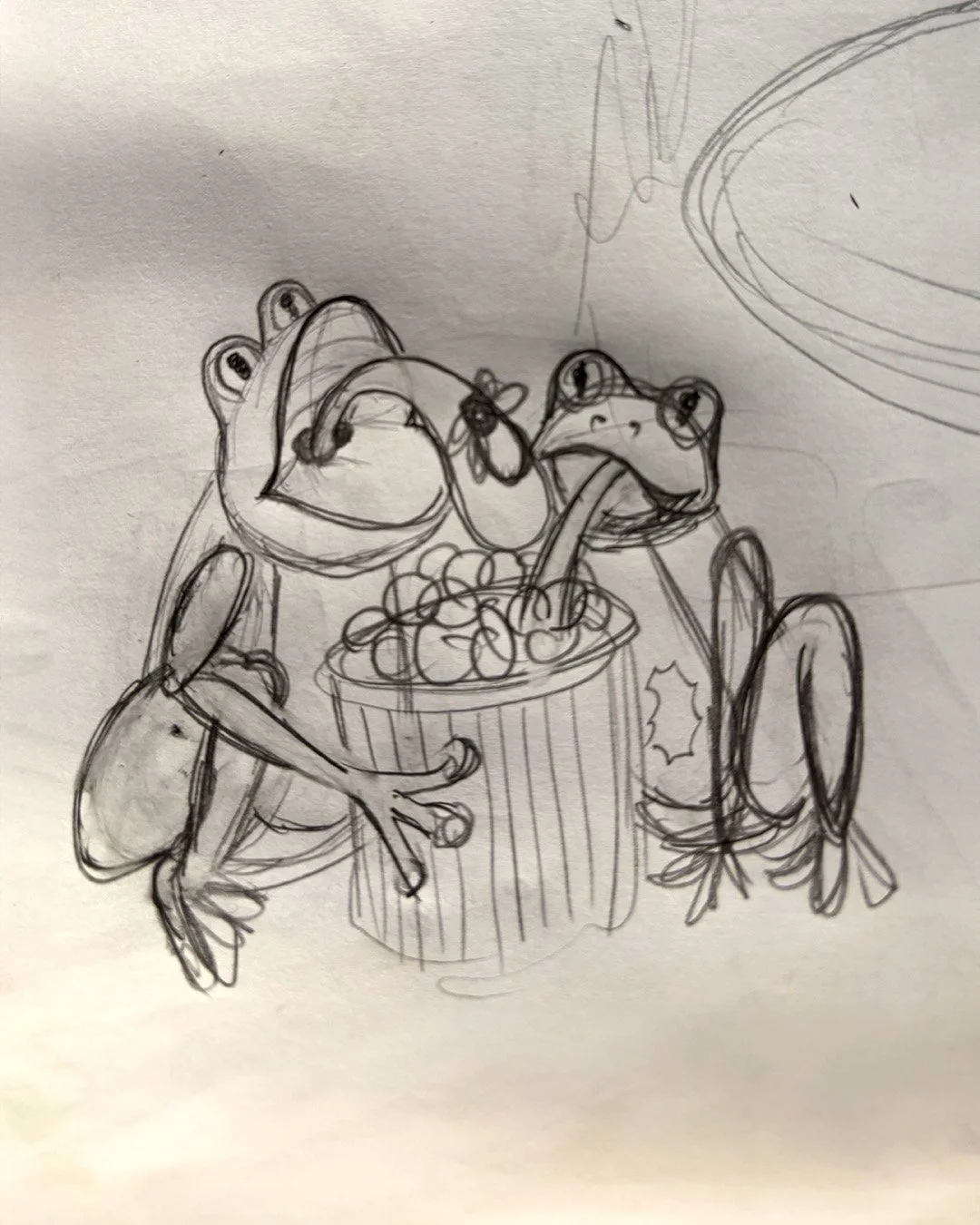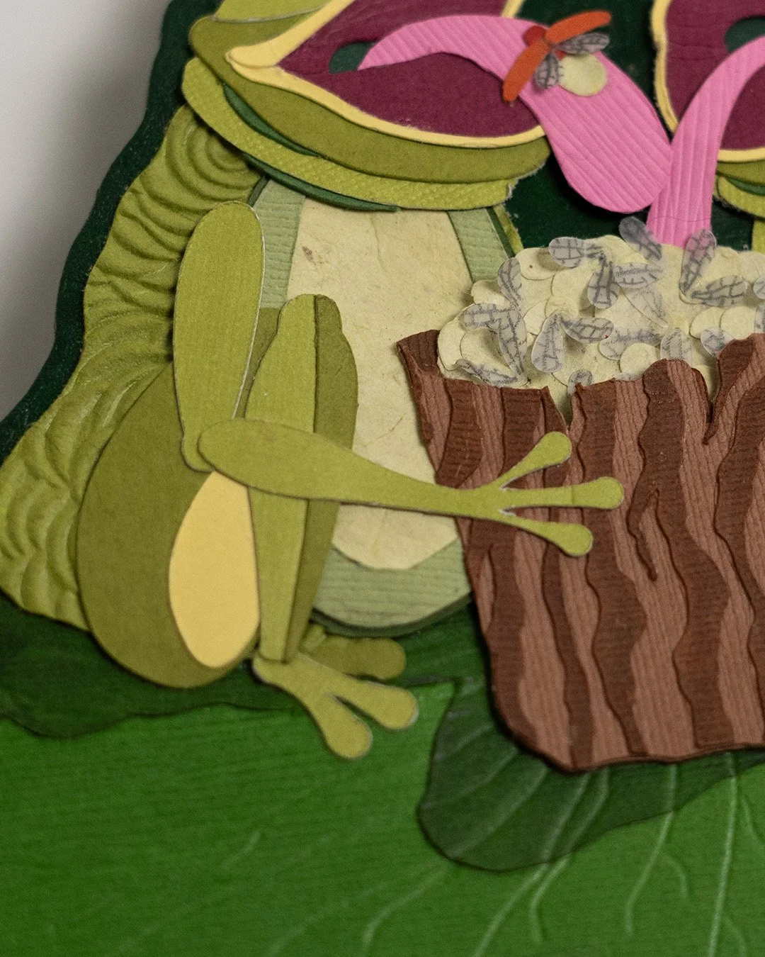 A layered paper art piece featuring two frogs enjoying a nice movie night.