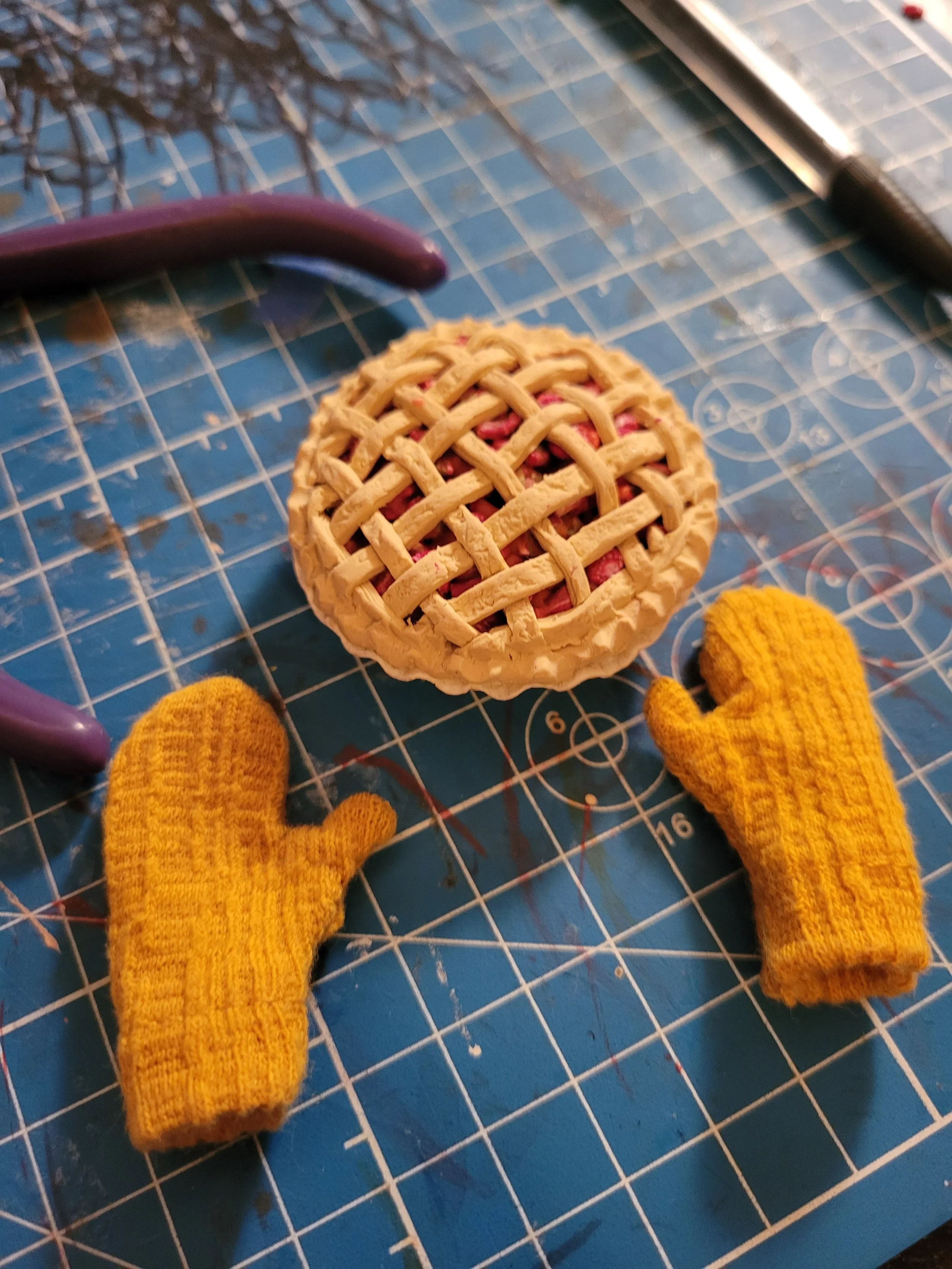 The pie before it was “baked” and my little oven hand-woven mitts.