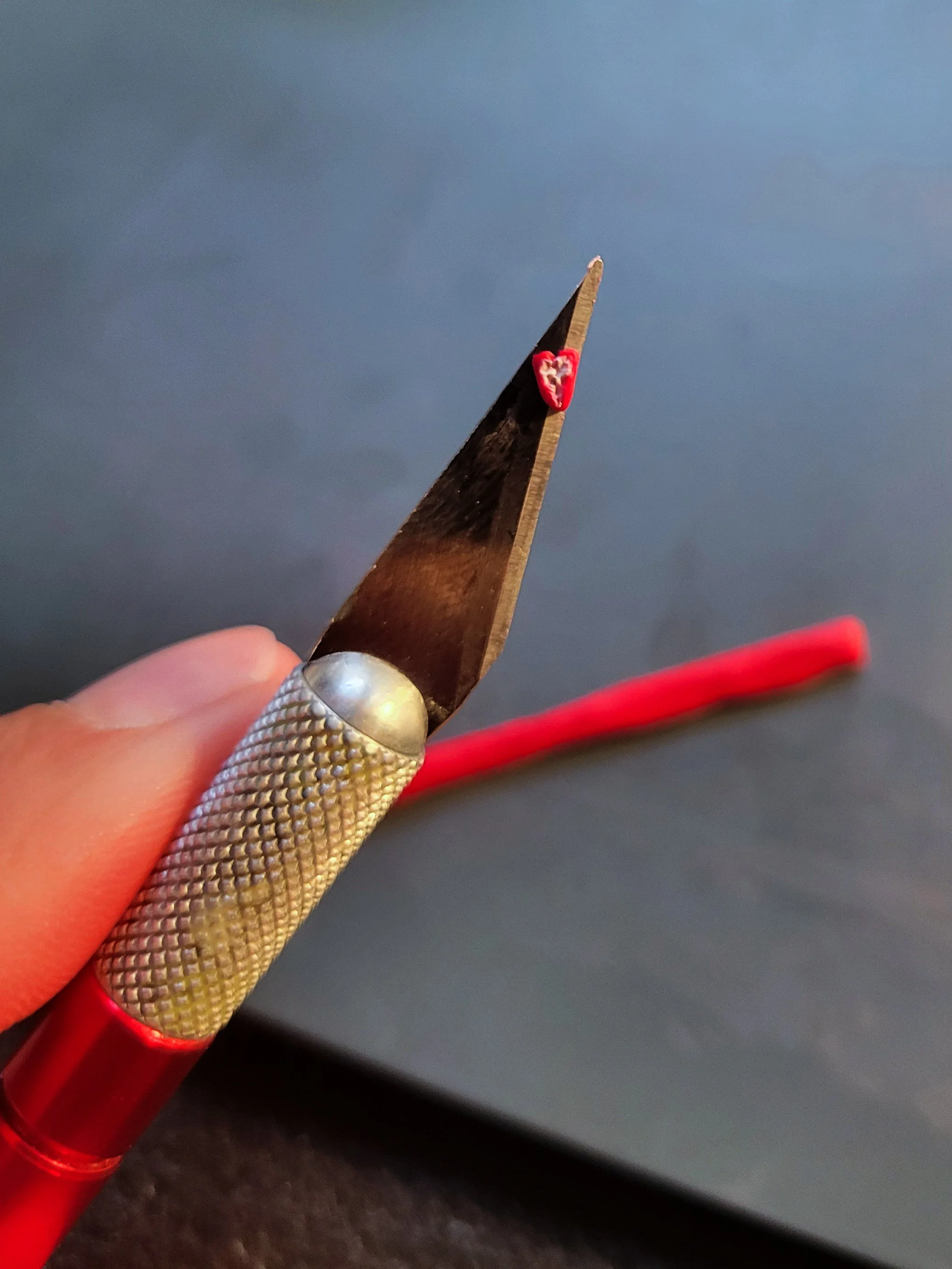 One of the tiny strawberry slices on the tip of an X-acto knife.